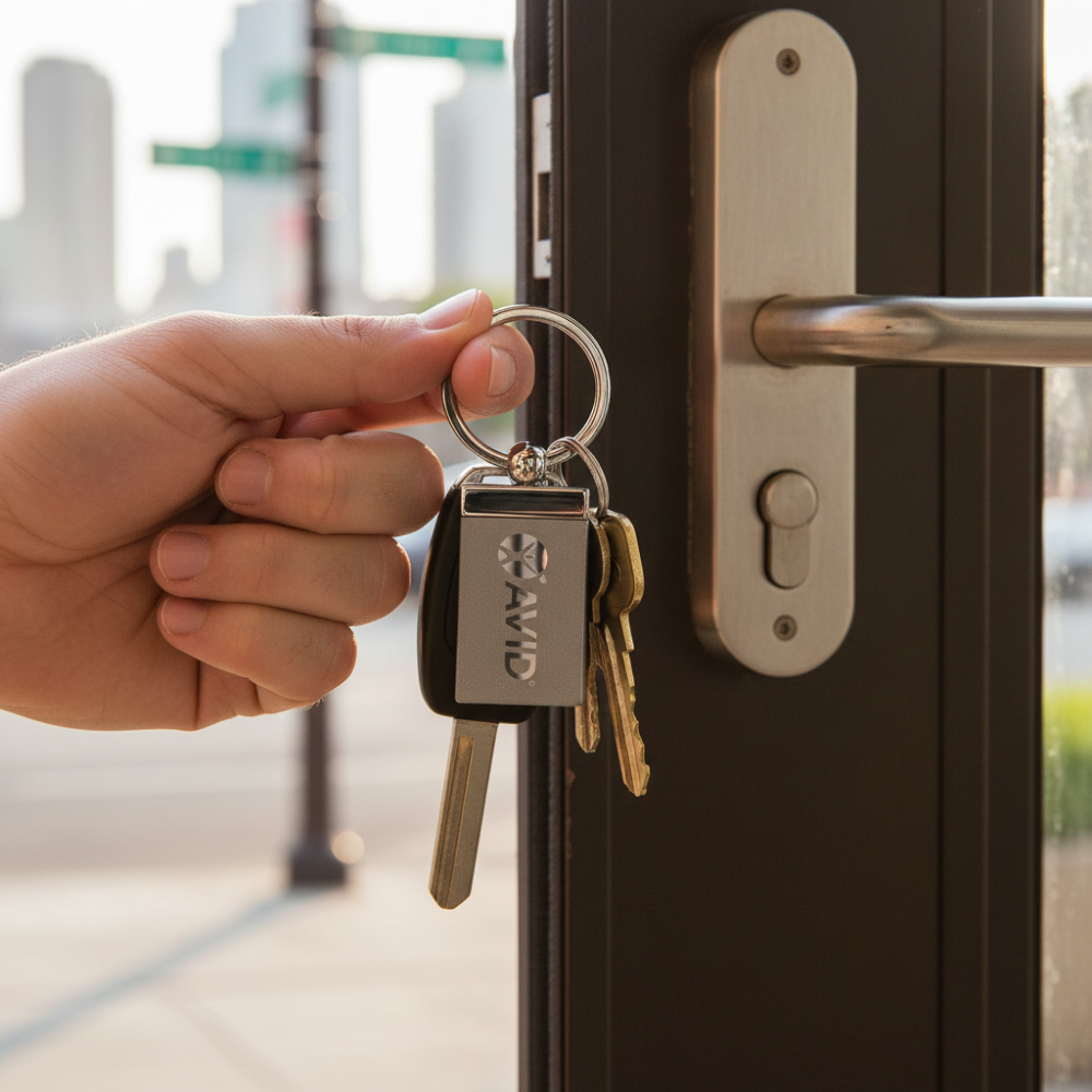 Rectangular heavyweight metal keyring with two-tone shiny and matte gunmetal finish.