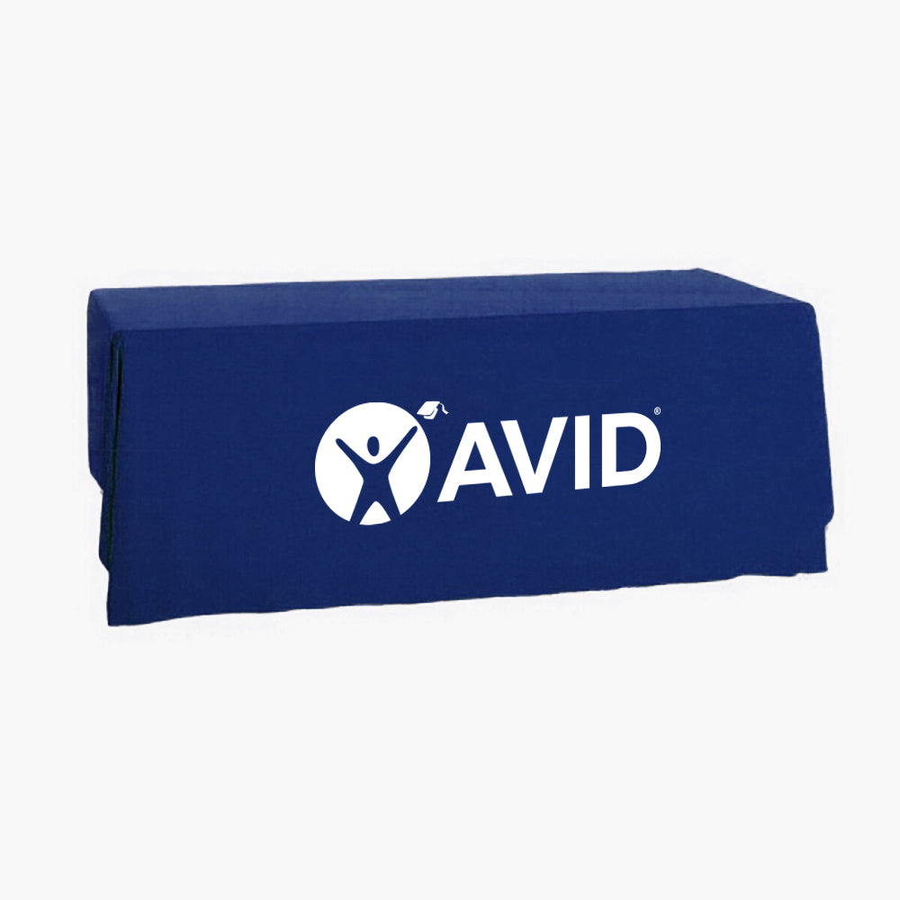 This 8 ft. draped table cover is made of durable 7 oz. poly / cotton twill with 100 x 56 thread count and 3-5% shrinkage. The fabric is flame retardant and complies with MVS 302 standards. Measures 132" L x 60" W in dimension. Do not dry clean this product. Wash cold in a gentle cycle and tumble dry low. Do not iron printed areas. Made in the USA.