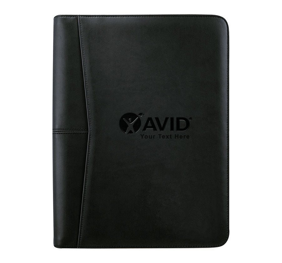 The AVID Writing Pad features seven business card holders, two USB flash drive holders, one gusseted document pocket, one gusseted elastic media pocket, and a mesh ID display window. It also has a convenient pen loop to hold your stylus or writing instrument. This item includes one 11" H x 8.5" W writing pad.