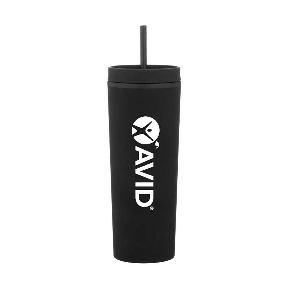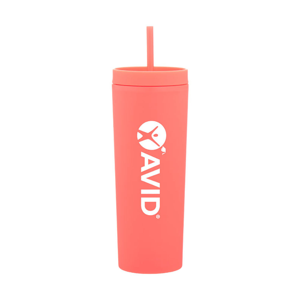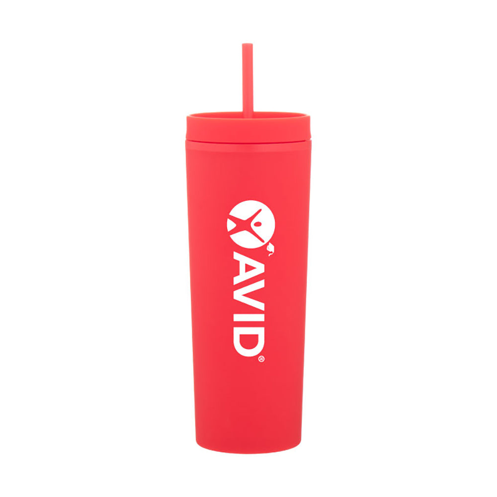 17 oz double wall acrylic tumbler with matching threaded lid, matching soft straw, and rubberized finish.